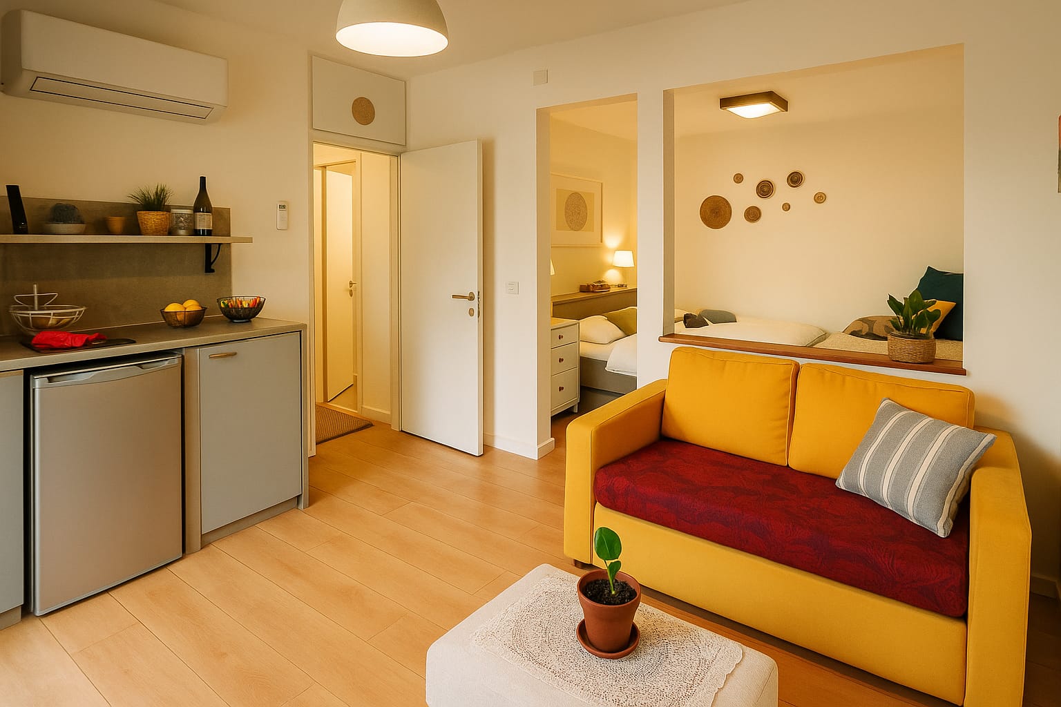 יחידה זוגית־משפחתית רגועה ומוארת, עם ספה נפתחת לילדים, מטבחון נוח ומרפסת הפונה אל הירוק. חלל נקי ופשוט שמרגיש כמו מקלט קטן של שקט וטבע.